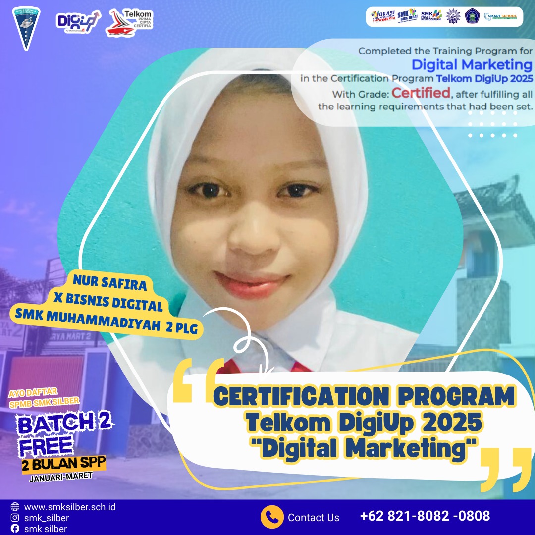 Alhamdulillah, kabar membanggakan kembali hadir dari siswa-siswi hebat SMK Muhammadiyah 2 Palembang. Selamat kepada para siswa jurusan Bisnis Digital yang telah dinyatakan LULUS dan CERTIFIED dalam Program Pelatihan & Sertifikasi Telkom DigiUp 2025 bidang Digital Marketing.